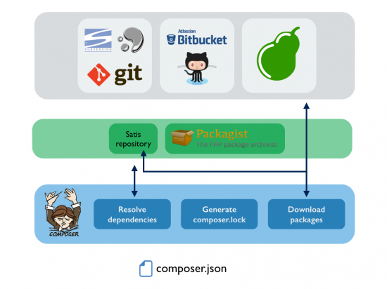 Unless we explicitly indicate that we want to use a different repository, Composer makes use of the default repository: Packagist. Composer will ask Packagist for information about all packages required in the composer.json file, as well as dependencies required by those packages. When Composer gets all that information, it solves the dependency graph using a SAT solver and generates the composer.lock file with the specific packages that must be installed in order to fulfil the requirements defined in the composer.json file. Finally, Composer downloads those packages from different sources: GitHub, Bitbucket, PEAR or any GIT/SVN/Mercurial repository.